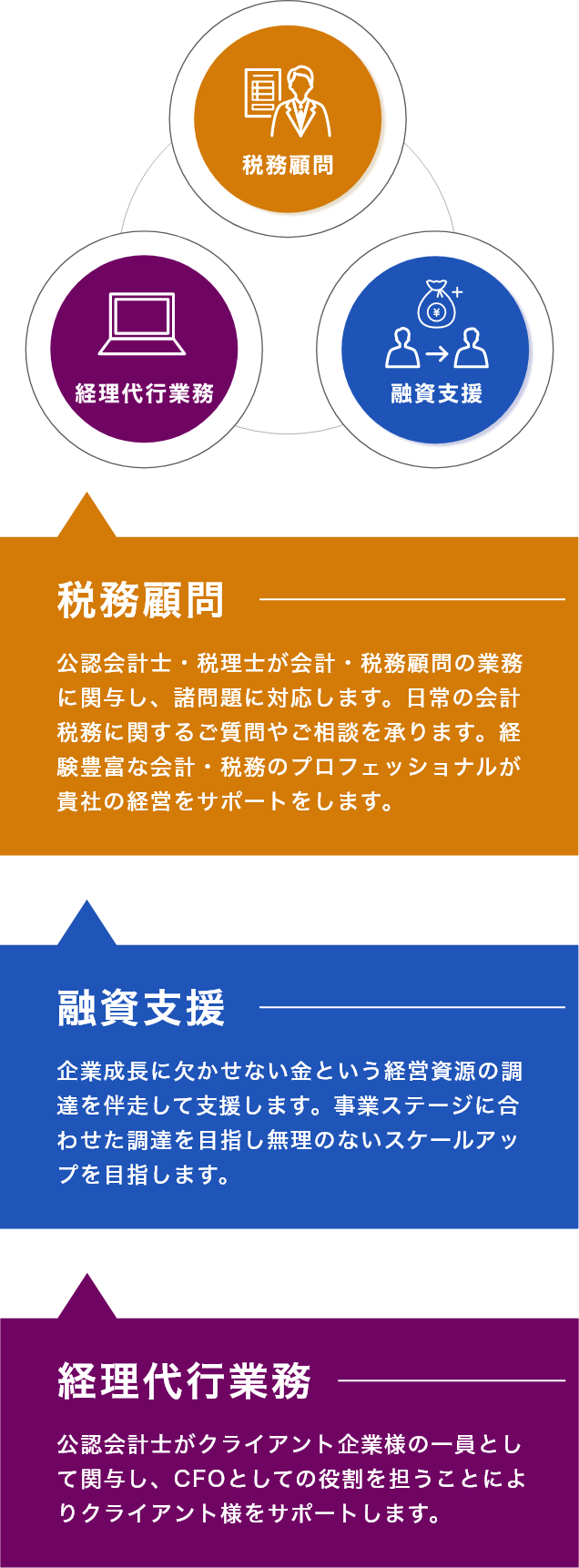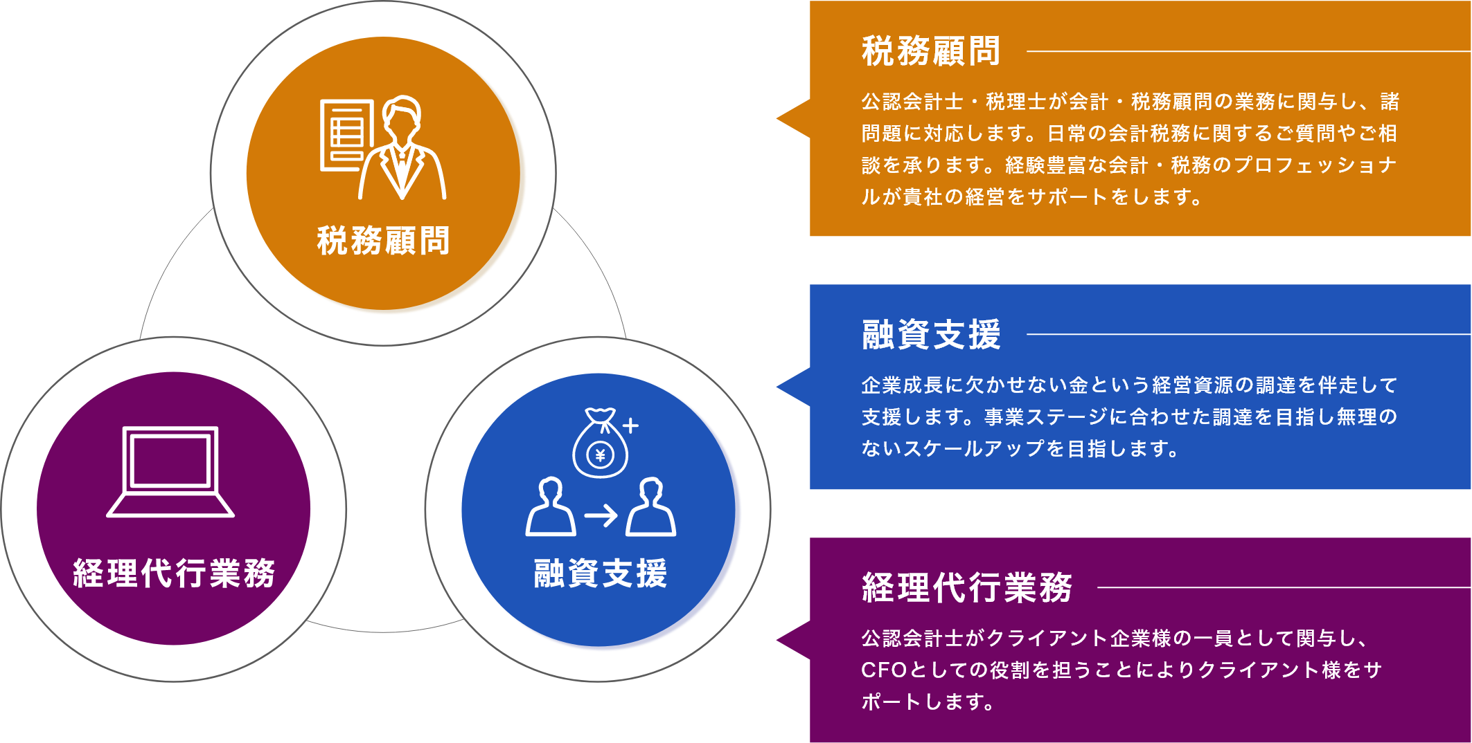 公認会計士・税理士が会計・税務顧問の業務に関与し、諸問題に対応します。